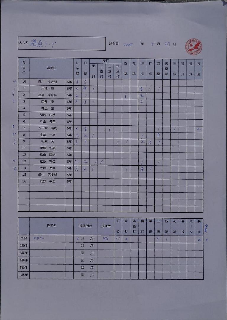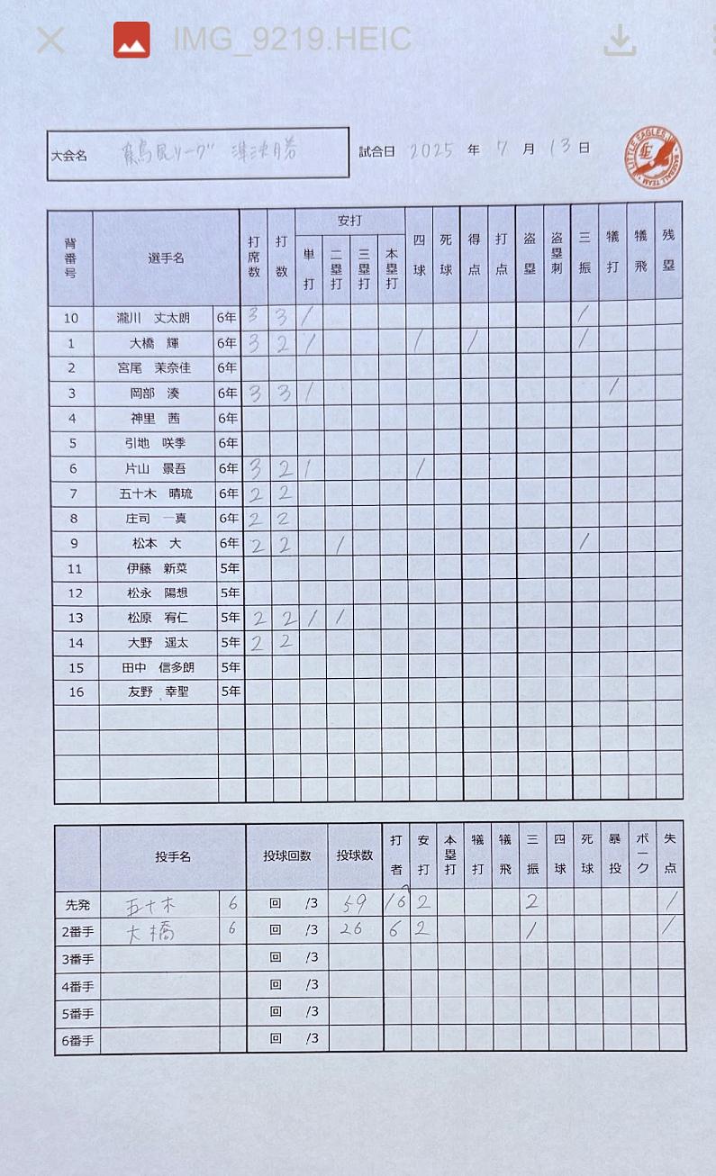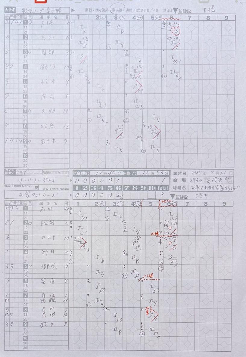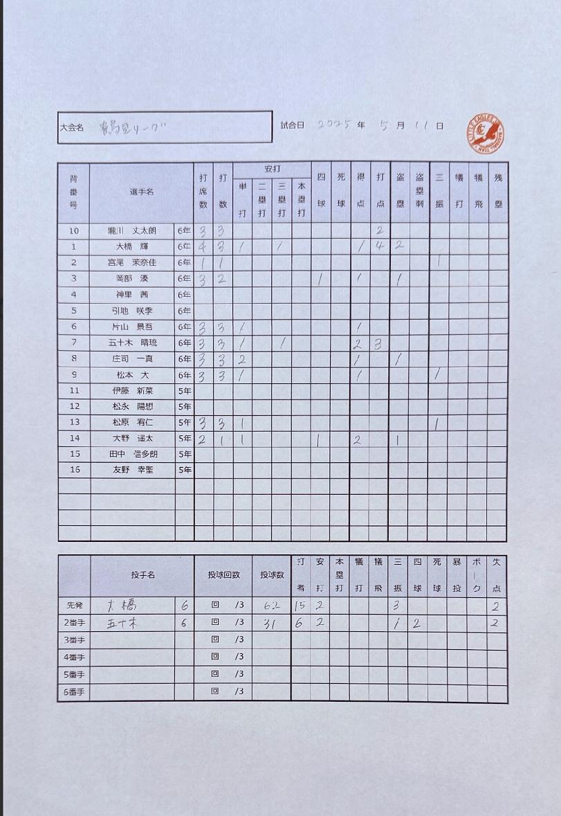 試合経過/鶴見リーグ春季大会第4戦。先発バッテリーは五十木-大橋。5回は大橋-瀧川。6回から投手五十木、一死から投手大橋。