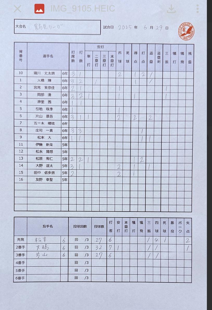| 元宮ファイターズ | 0 | 0 | 0 | 0 | 0 | 2x |