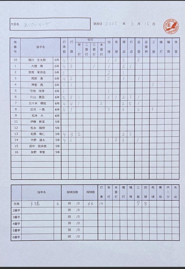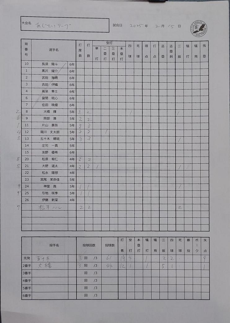 /安打/ /本塁打;五十木2 /三塁打;大橋 /単打;松原2、五十木、片山