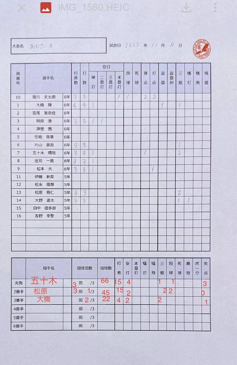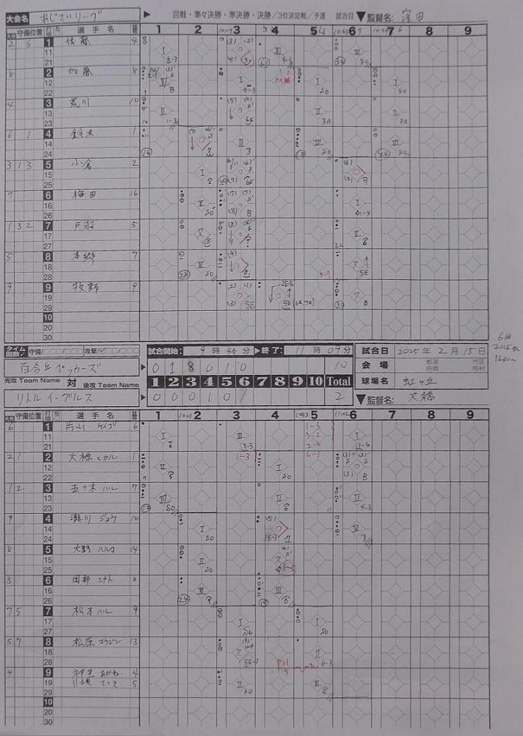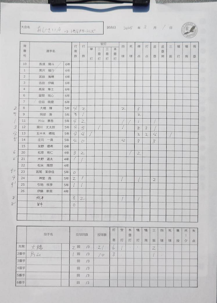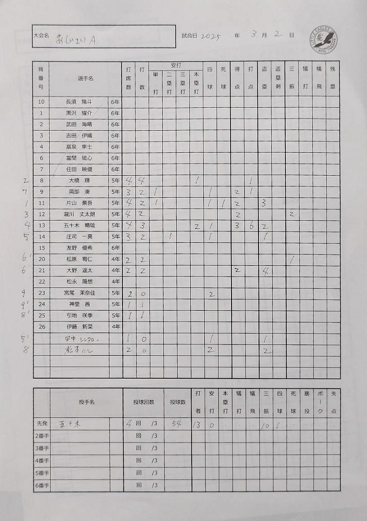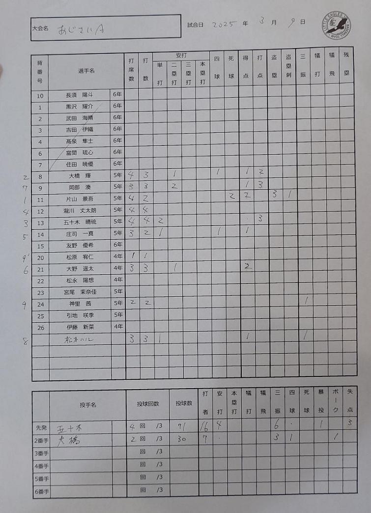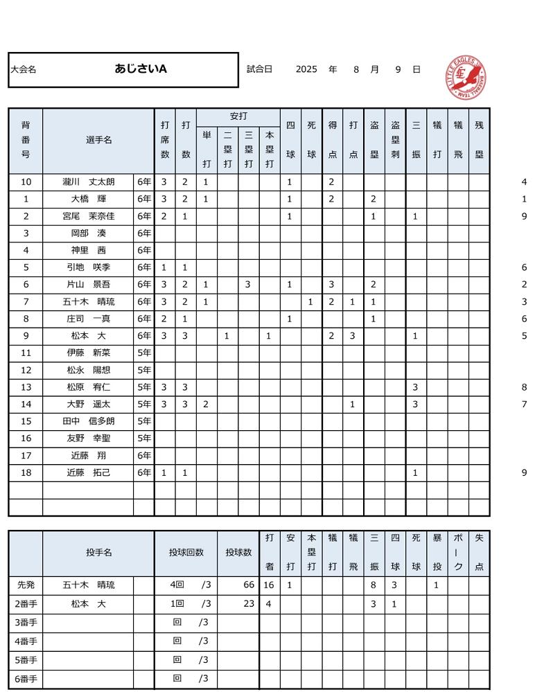 | リトルイーグルス | 0 | 0 | 0 | 2 | 0 | 1 | 0 | 3 | ● |