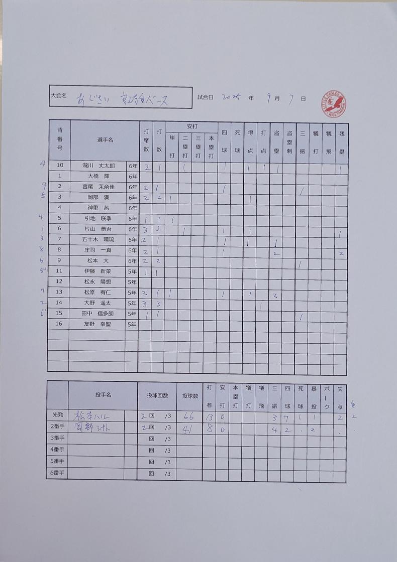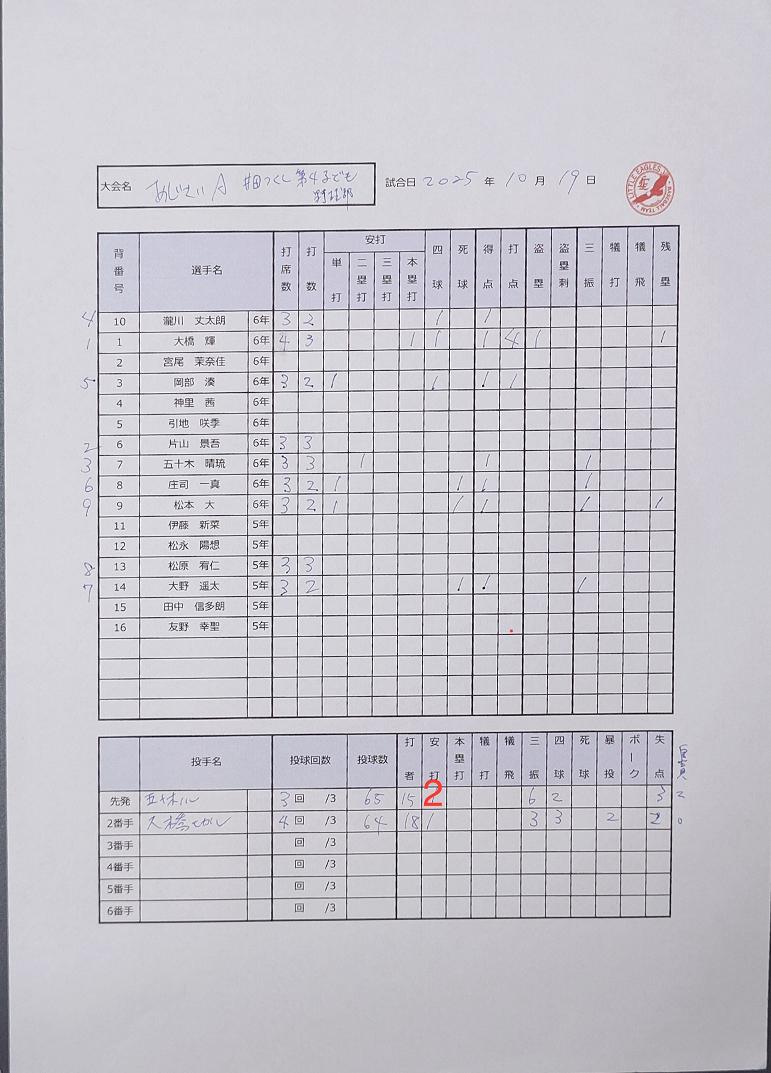 | 井田つくし第4子ども会野球部 | 2 | 0 | 1 | 1 | 0 | 0 | 1 | 5 | ● |