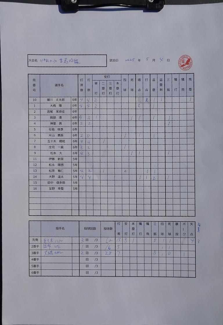 | 小倉少年野球部 | 1 | 0 | 1 | 0 | 0 | 0 | B | 5 | ● |