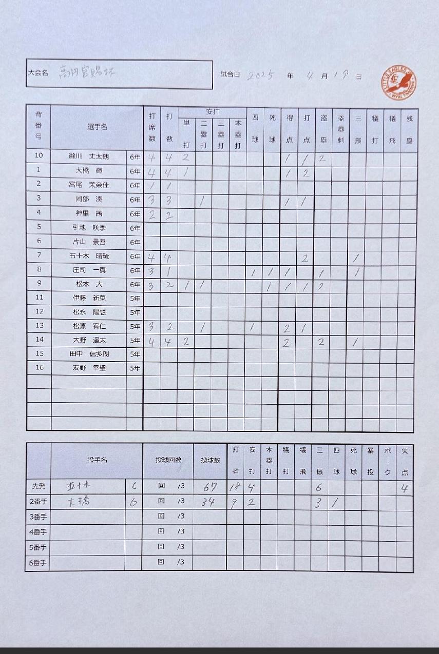 1点追加。 一方、守備では投手五十木は3回裏は三者凡退に抑えたが、4回裏に先頭4番から連打とエラーで2失点。しかし、5回から救援の