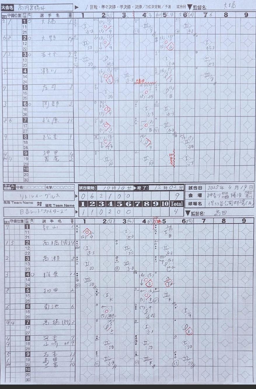 ○ リトルイーグルス 9 対 4 ● 日吉レッドファイターズ/高円宮賜杯横浜市大会通算;1勝0敗