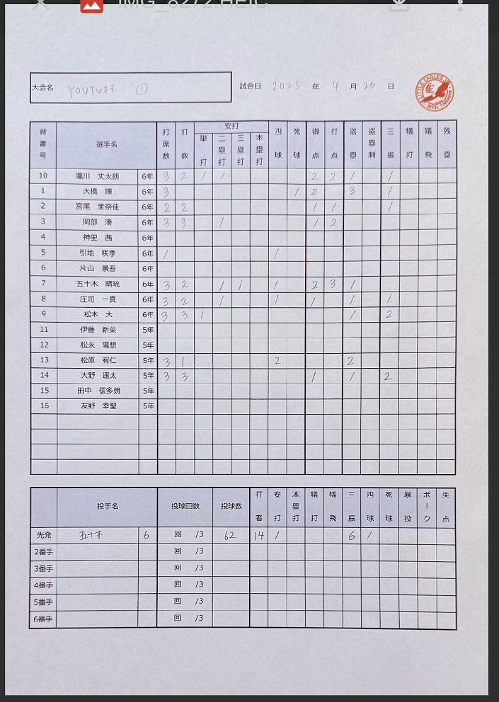 試合経過/youTV杯初戦。先発バッテリーは五十木-大橋。4回から投手岡部救援。